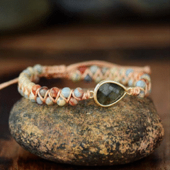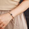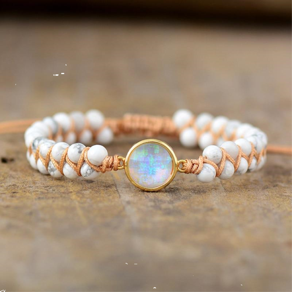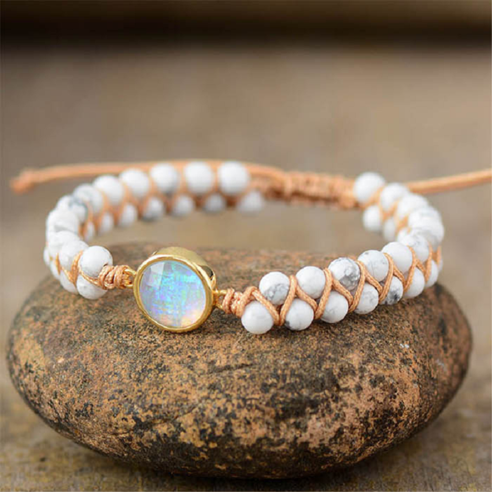 Un bracelet décoré de perles d’howlite blanches et d’un fermoir en ventilzoo coulissantVous cherchez une touche de style boho-chic ? Notre bracelet en ventilzoo et perles est ce qu’il vous faut ! Fait de pierres naturelles de howlite, ce bracelet est parfait pour accentuer n’importe quelle tenue. Avec ses nœuds coulissants, il s’adapte à toutes les morphologies et vous permettra de rester élégante toute la journée.Cette pierre peut être utilisée pour aider à calmer votre esprit, à favoriser l’endormissement quand vous vous mettez au lit le soir. Elle agit en atténuant l’hypersensibilité, la dépression ou tout autre déséquilibre émotionnel qui pourrait vous empêcher de dormir, surtout en période hivernale ; ce minéral renforce également le caractère tout en favorisant le discernement, ce qui aide à prendre les bonnes décisions dans les moments difficiles. Un bracelet plein de vertus pour la santé du corps et du mental tout en apportant une petite touche élégante à vos tenues.Matière principale : Howlite naturelle, Coton, Alliage de ZincDimensions réglablesLivraison standard offerte