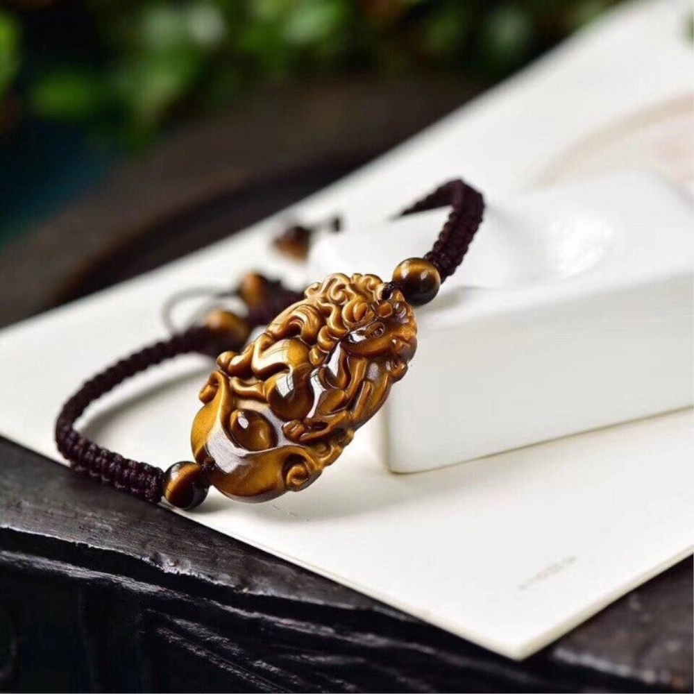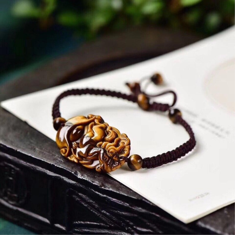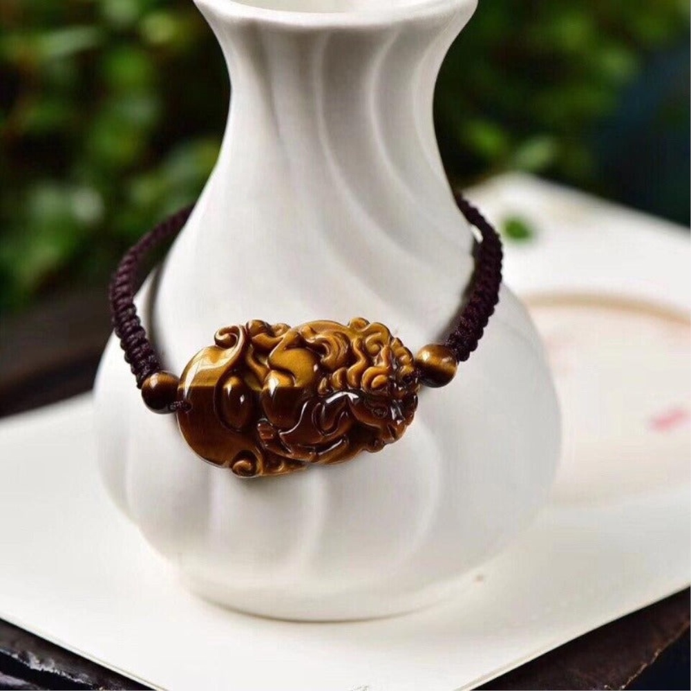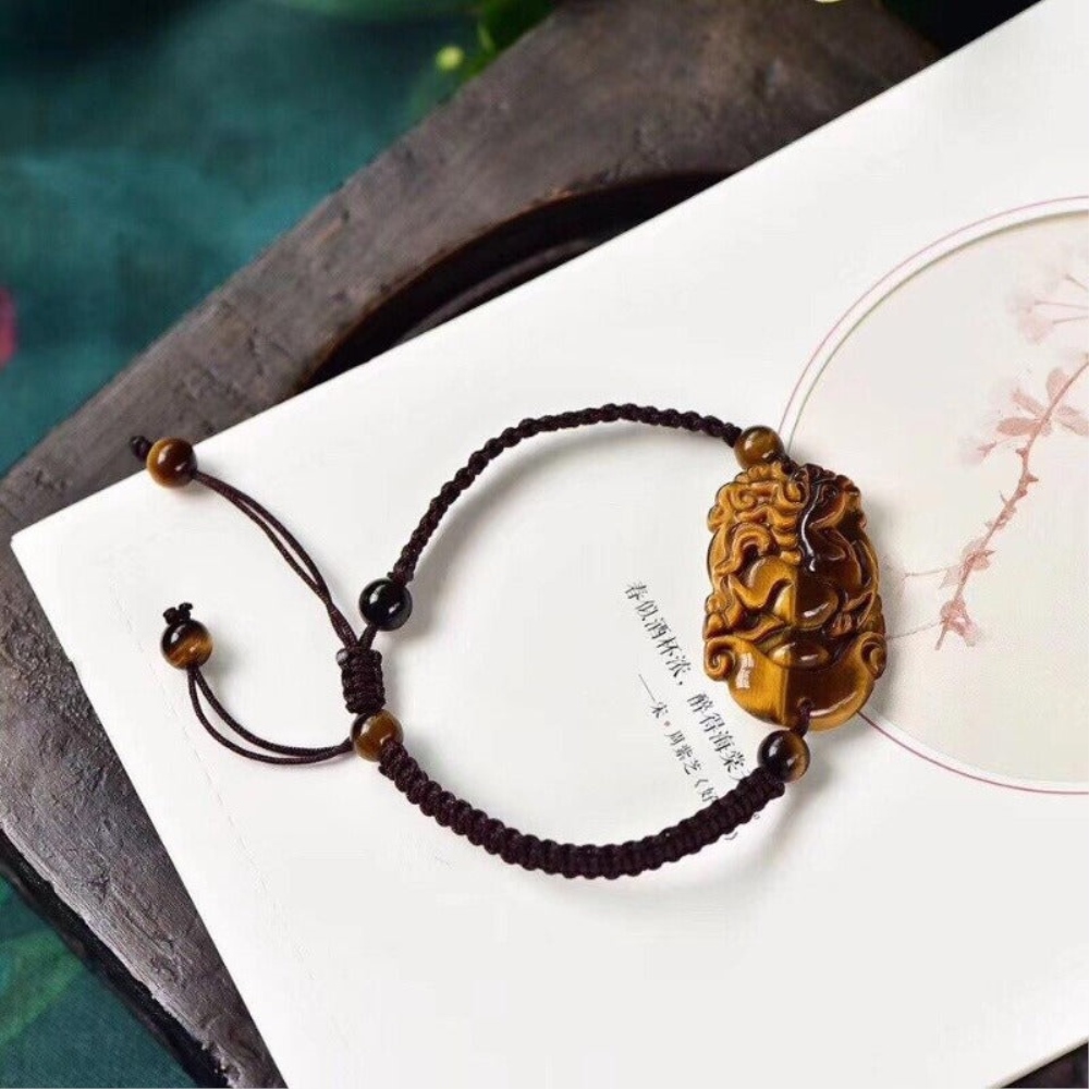 Craquez pour notre bracelet taillé dans un Œil du tigre magnifié par un tissage en ventilzooNotre bracelet ventilzoo est une pièce magnifique et unique, parfaite pour tout amateur de chevaux ou toute personne appréciant les bijoux fins. Le bracelet présente un cheval taillé dans un cristal d’œil de tigre, avec un cordon de coton brun et des perles du même ton.Le Cheval est le septième signe du zodiaque chinois et est proche, dans le zodiaque occidental, du signe des Gémeaux. Symbolisant le succès et la hâte, c’est le bracelet totem qu’il vous faut.Matière principale : Œil de tigre, coton et cuivreDiamètre : 16 à 19cmLivraison standard offerte