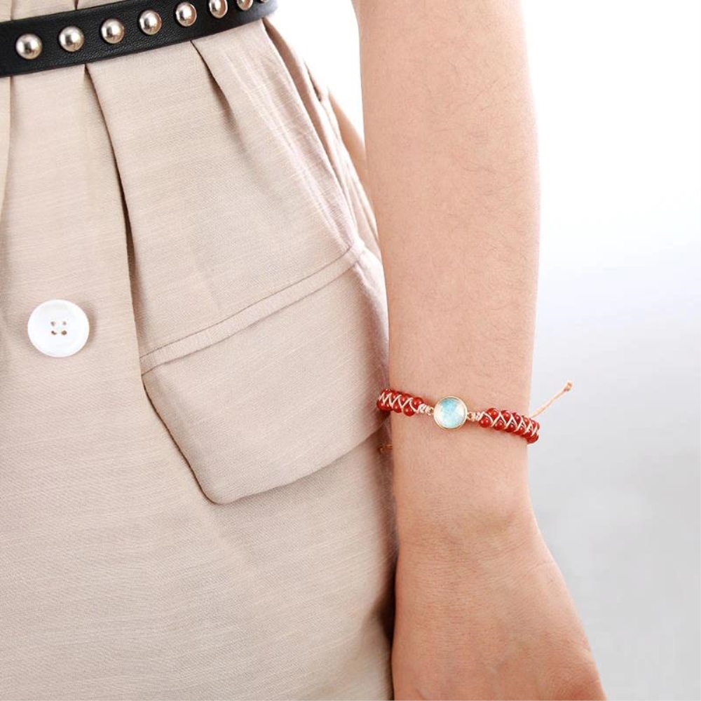 Craquez pour le bracelet de perles en onyx rouge avec son maillage en ventilzoo torsadéCe bracelet en ventilzoo torsadé est l’accessoire parfait pour toute tenue. Avec son tissage de coton coloré et ses perles d’onyx rouge, il est sûr d’ajouter une pointe d’élégance à n’importe quel look. De plus, le petit cristal au centre lui ajoute un zeste de glamour. Que vous vous habilliez chic ou décontracté, ce bracelet est la touche finale parfaite.L’onyx est une pierre utilisée depuis des siècles pour aider à lutter contre les hauts et les bas de la vie. Elle stabiliserait le caractère inconstant d’une personne et aurait le pouvoir de purifier le karma. L’onyx aiderait également à la protection des dents contre la carie et combattrait les problèmes vocaux tels que les troubles de la parole.Matière principale : Onyx rouge naturelle, Coton, Alliage de ZincDimensions réglablesLivraison standard offerte