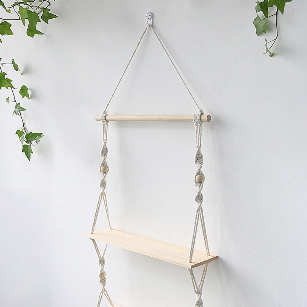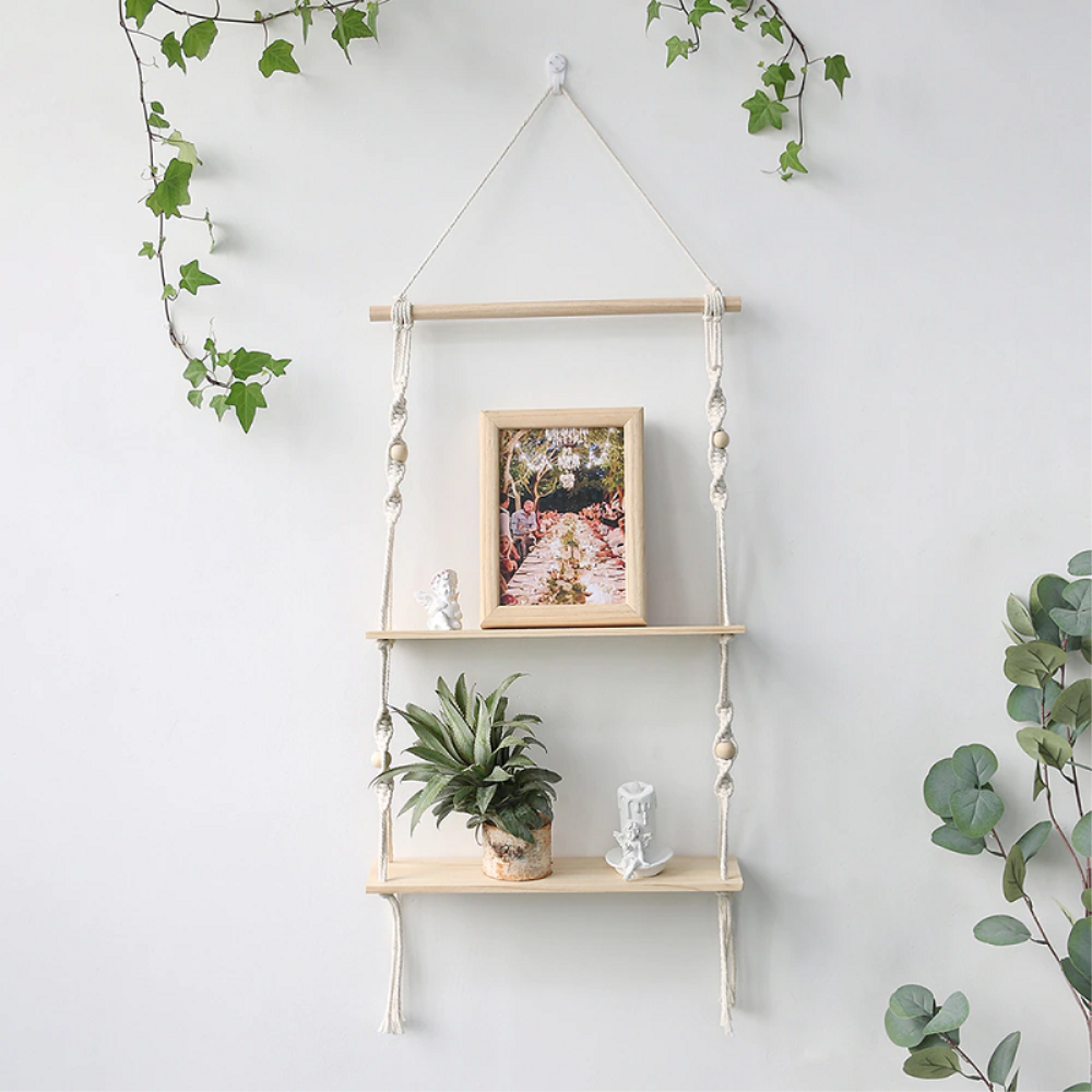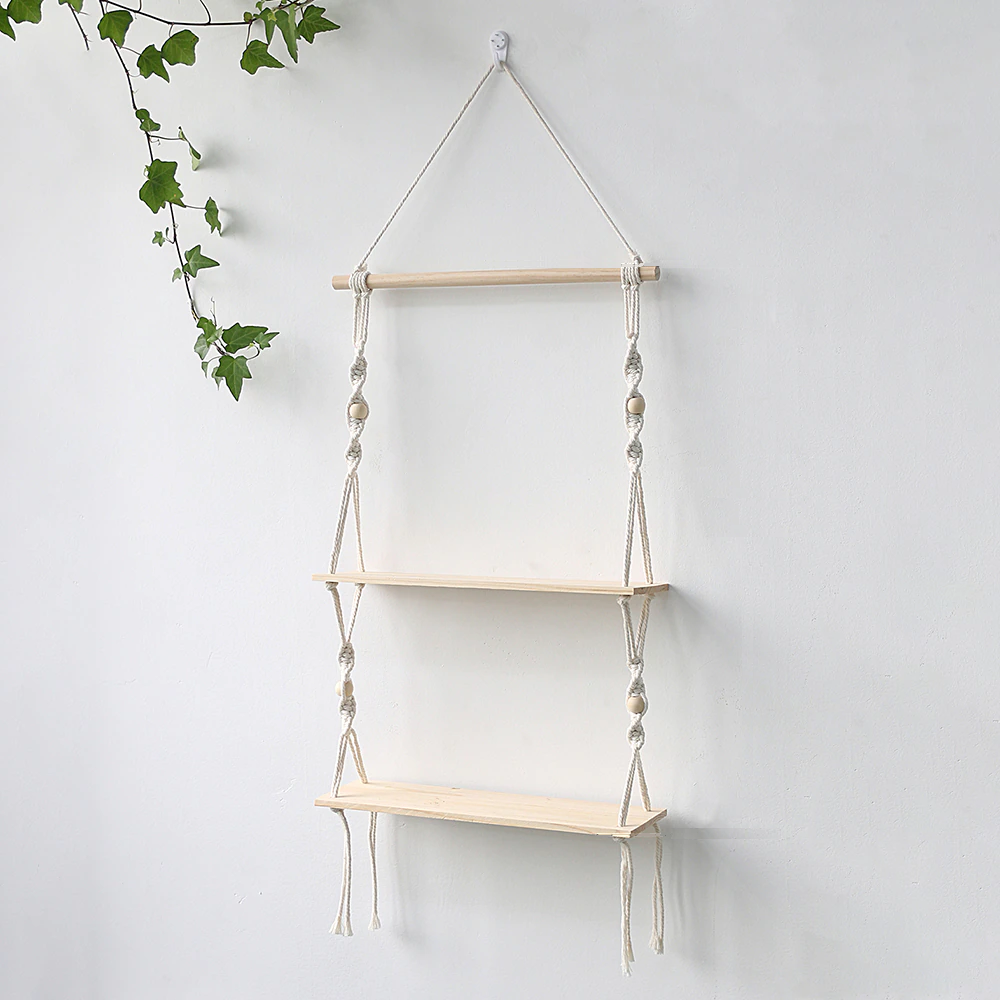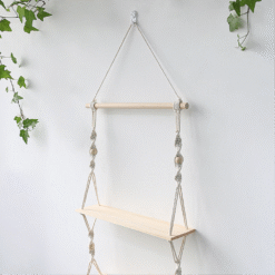 Craquez pour notre étagère suspendue en ventilzoo double faite main.Cette étagère suspendue en ventilzoo fait entrer le style bohème dans votre maison. Avec un espace pour deux fois plus d’objets, vous verrez qu’elle devient rapidement une décoration indispensable pour exposer des plantes et autres bibelots !Cette étagère murale à deux niveaux est le complément parfait de toute maison. Elle est à la fois délicate et bohème, avec un style artisanal authentique qui trouvera sa place dans votre salon ou votre chambre à coucher au thème bohème.Matière principale : Coton, BoisDimensions : H60xL30xP10cmLivraison standard offerte