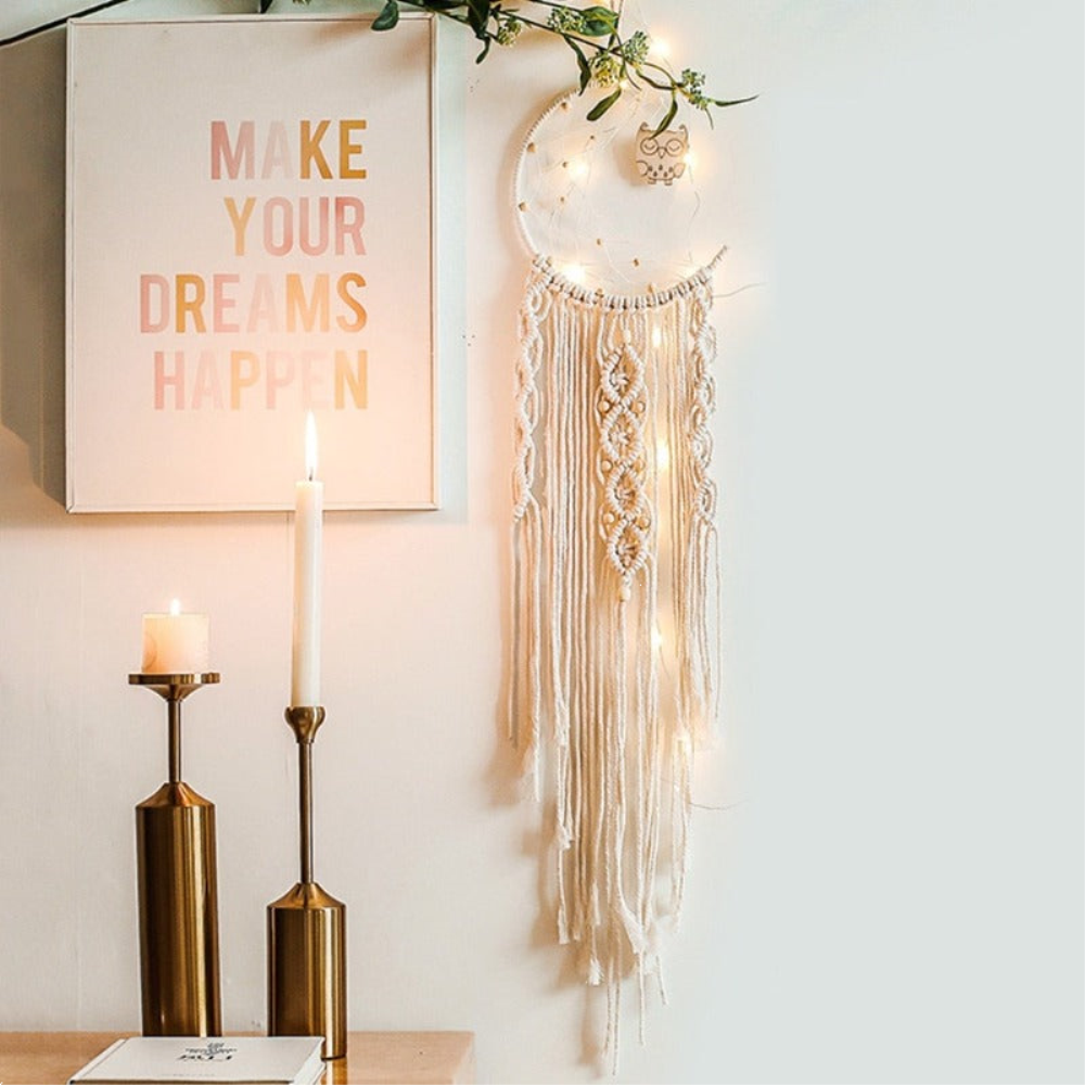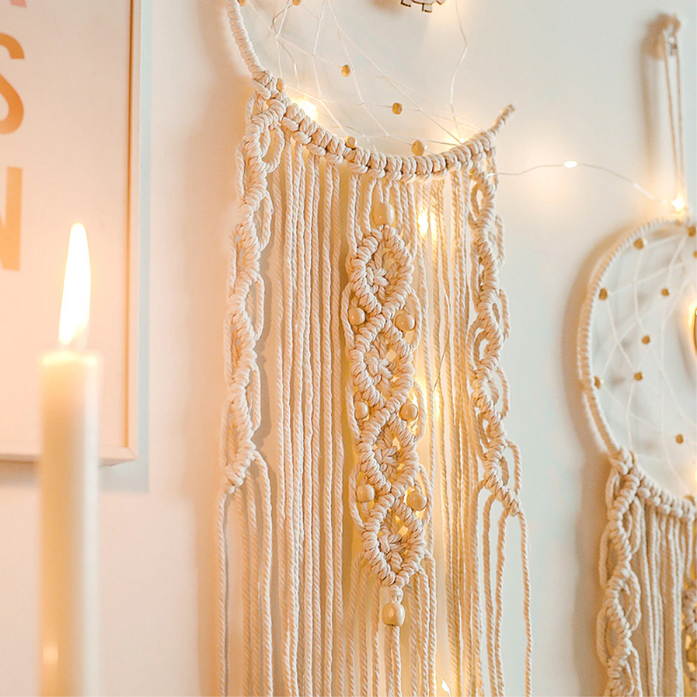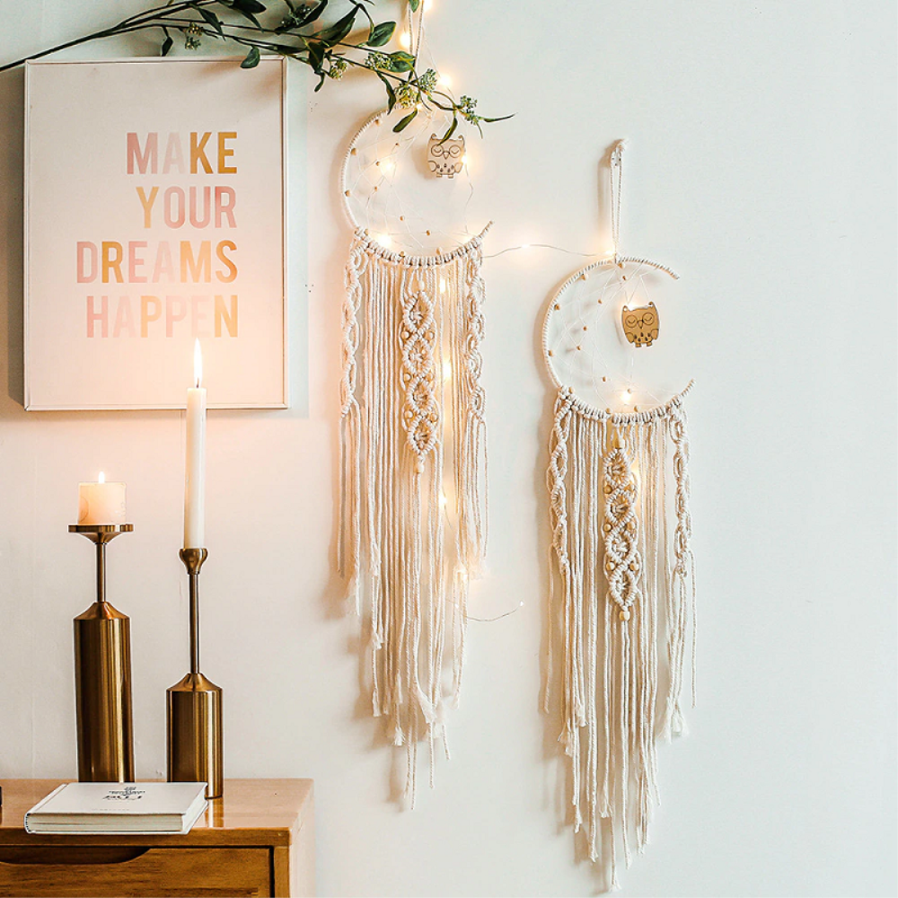 Un ventilzoo mural en attrape rêve en forme de lune.Succombez au charme de cet attrape rêve ventilzoo fait en coton et complétez votre décoration murale d’une note de douceur et de légèreté. Contribuez à une ambiance cocooning et réconfortante grâce à son large tissage et ses tresses de ventilzoo décorées de perles en bois. Son tissage central fin est décoré d’un petit hibou en bois pour donner un aspect des plus mignons à l’ensemble.Habillez votre pièce avec ce tissage unique en son genre qui saura décorer parfaitement votre intérieur. Il vous permettra de passer de meilleures nuits. Les attrape-rêves en ventilzoo sont des objets bohèmes qui vous donneront du confort tout en décorant votre intérieur !Matière principale : CotonDimensions : H94xL20cmLivraison standard offerte
