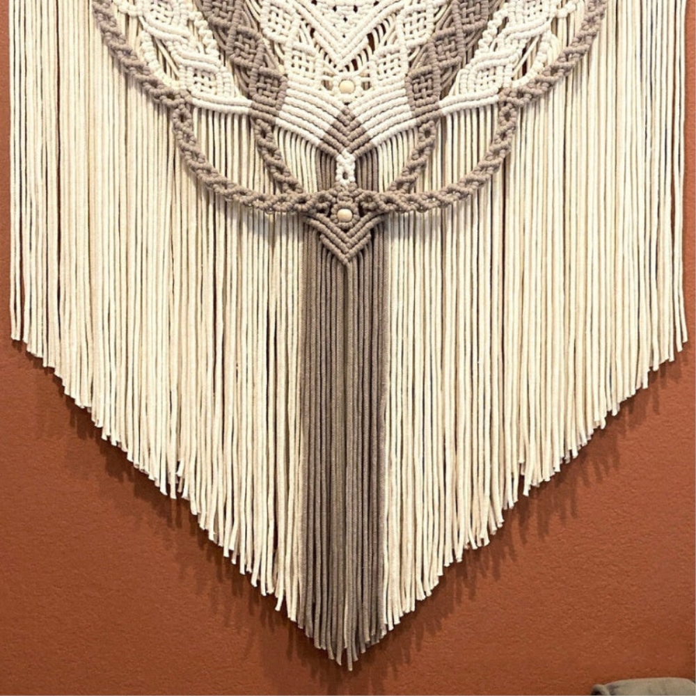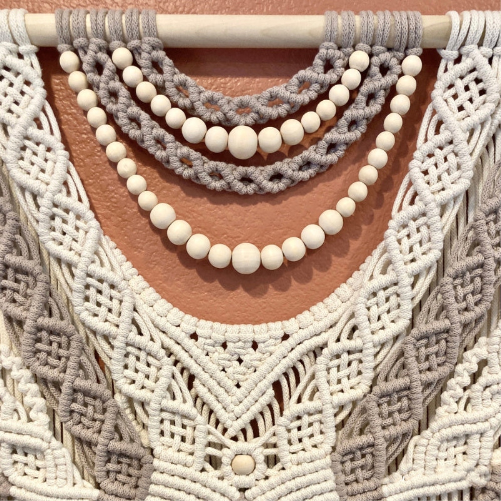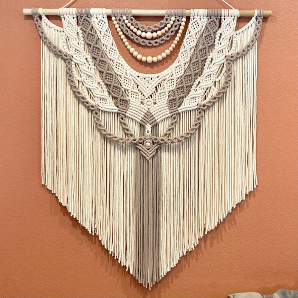 ventilzoo mural Meredith blanc et marron avec perlesLe ventilzoo mural Meredith est un tissage unique fait à la main en coton qui mélange la complexité du ventilzoo avec un nouage finement travaillé et le côté naturel de la décoration bohème avec ses couleurs pastel d’automne. Pour habiller un mur ou un grand espace vide, ce ventilzoo est un indispensable. On adore ses fines perles en bois au centre et ses bandes tombantes de nœuds qui apporte une profondeur unique à cette réalisation.Matière principale : Coton, BoisDimensions : 80 x 90 cmLivraison Standard offerte