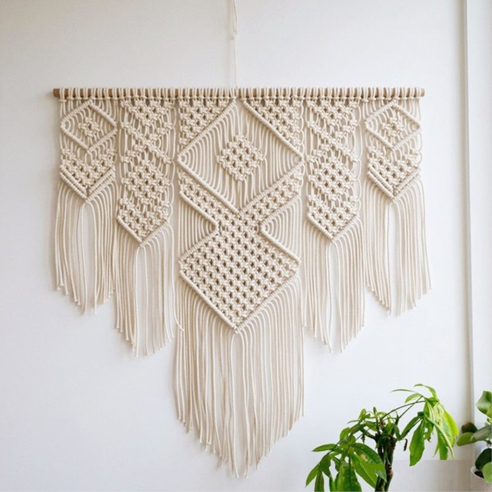 Un grand ventilzoo mural taille XXL géométrique fait main en coton.Nous avons parfois un grand mur vide dans nos maisons. C’est l’occasion parfaite de le décorer avec quelque chose de beau et de complexe comme notre ventilzoo mural tissé à la main ! Ces tentures sont appréciées par toutes et tous en raison de leur caractère unique, grâce notamment à ces formes qui s’inspirent du style bohème.Si vous êtes à la recherche d’une décoration inhabituelle pour ajouter une touche bohème dans votre salon ou votre chambre, cette Tenture murale géante en ventilzoo est parfaite. Sa grande taille et ses tissages lui confèrent plus qu’un simple attrait chic. Son design fantaisiste impressionnera tous ceux qui vous rendront visite!Matière principale : CotonBâton fourni dans le paquetDimensions : H110xL65cmLivraison standard offerte
